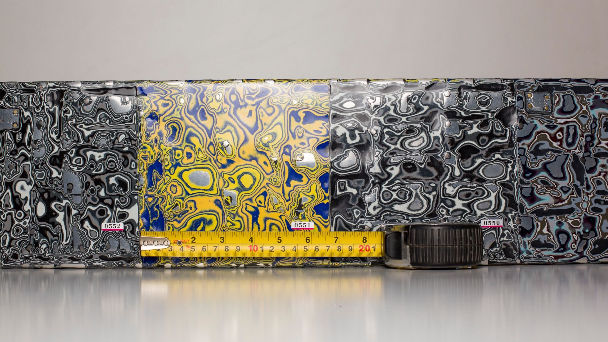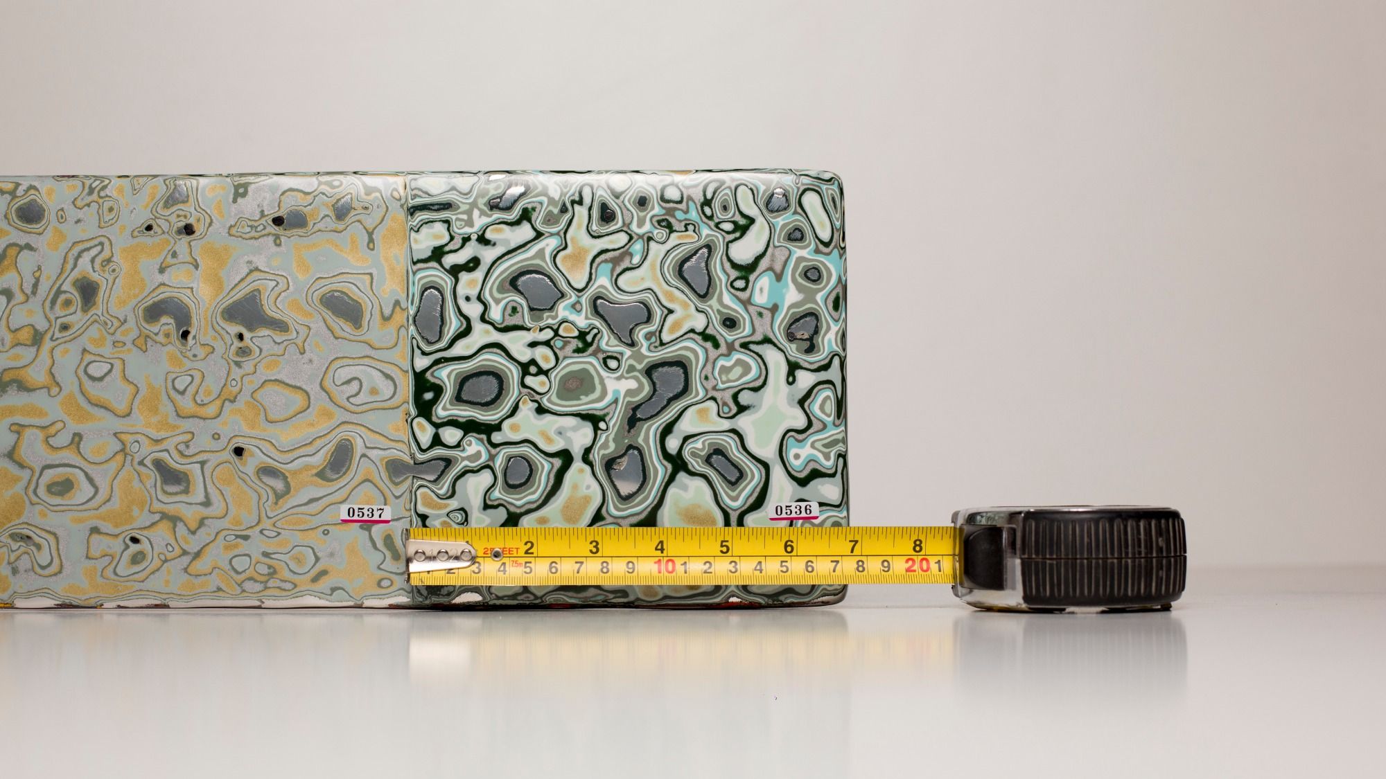 Since its beginning , Roland Mellan has created a texture made of metal cladding on which he applies multiple layers of chromatic  lacquers. This material is his creative seal, which he makes evolve according to the pieces.